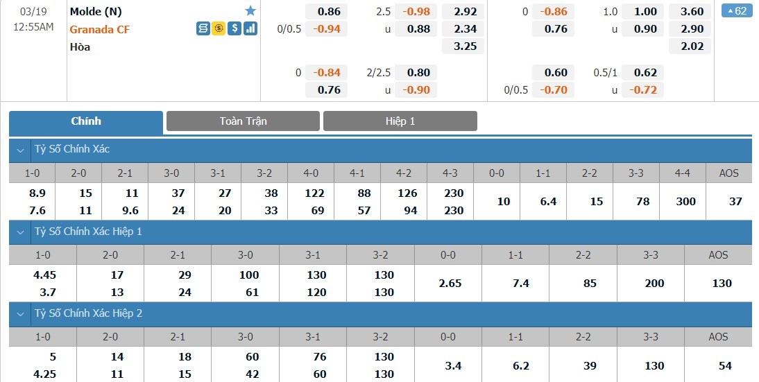 Dự đoán kèo tỷ số hiệp 1: Molde 0-2 Granada