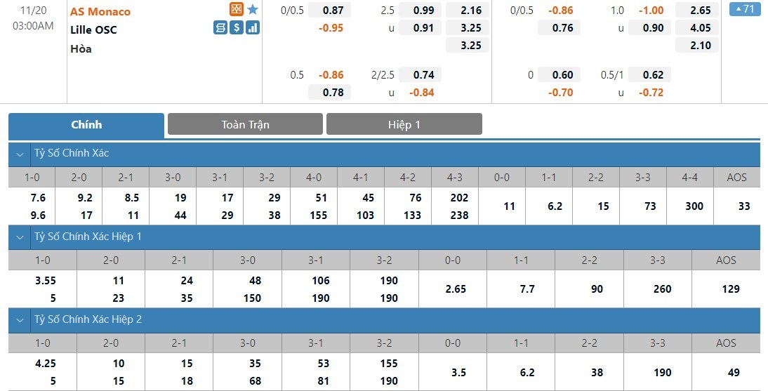 Dự đoán kèo tỷ số hiệp 1: Monaco 0-0 Lille