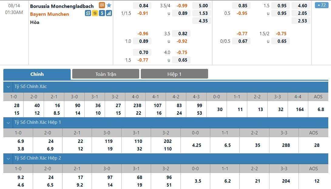 Bayern Munich vẫn sẽ được đánh giá cao hơn Monchengladbach rất nhiều ở kèo đấu này dù họ là đội phải làm khách. Tỷ lệ cược của Bayern Munich là 1 ăn 1.53 trong khi đó Monchengladbach có tỷ lệ cược là 1 ăn 5.00. Tỷ số hòa có tỷ lệ cược là 1 ăn 4.35. Bayern Munich lúc này vẫn đang tỏ ra nhỉnh hơn Monchengladbach khá nhiều về thực lực và đội khách được dự đoán vẫn sẽ có một chiến thắng ở trận này.