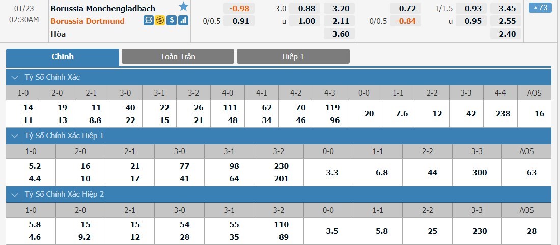 Soi kèo tài xỉu, kèo tỷ số Monchengladbach vs Borussia Dortmund