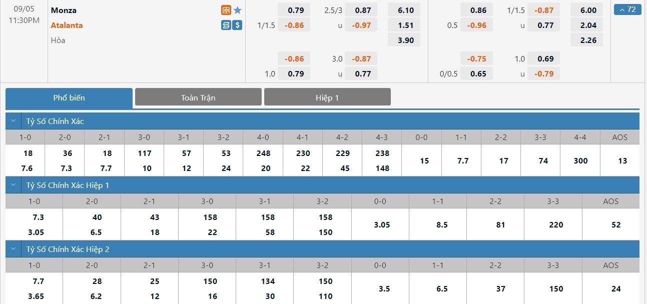 Soi kèo tài xỉu, kèo tỷ số Monza vs Atalanta