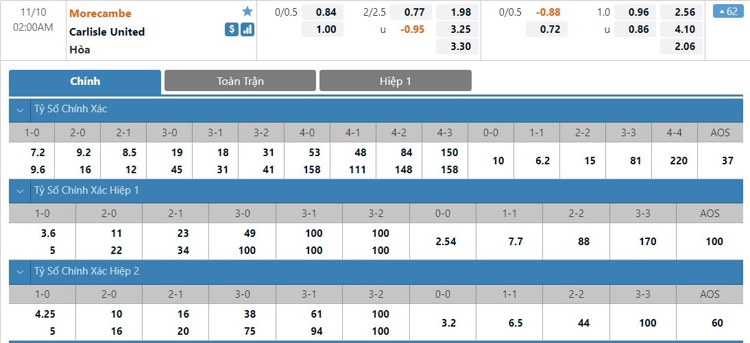 Dự đoán kèo tỷ số hiệp 1: Morecambe 1-1 Carlisle