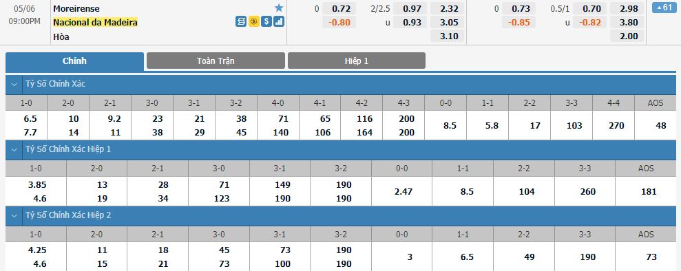 Dự đoán kèo tỷ số hiệp 1: Moreirense 1-0 Nacional