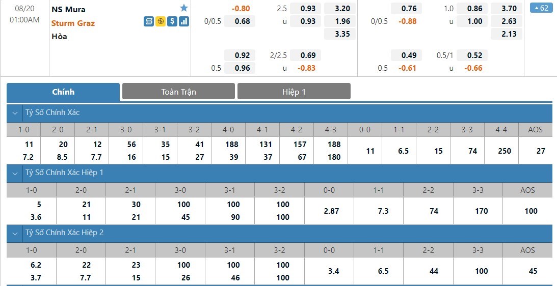 Dự đoán kèo tỷ số hiệp 1: Mura 0-2 Sturm Graz