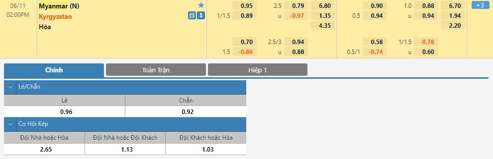 Kèo châu Á toàn trận: Kyrgyzstan Republic -1 1/4 (FT)