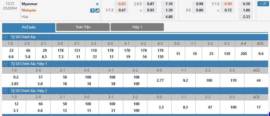 Dự đoán kèo tỷ số hiệp 1: Myanmar 0-1 Malaysia