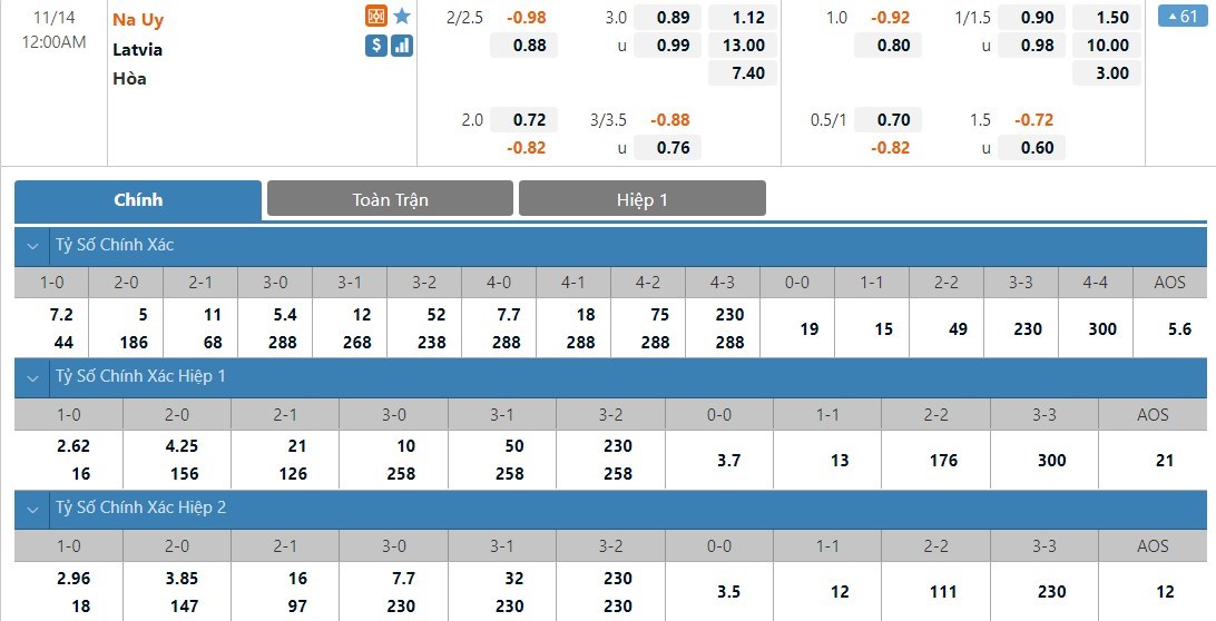 Na Uy sẽ được đánh giá cao hơn Latvia rất nhiều ở kèo đấu này. Tỷ lệ cược của Na Uy chỉ là 1 ăn 1.12 trong khi đó Latvia có tỷ lệ cược lên tới 1 ăn 13.00. Tỷ số hòa cũng có tỷ lệ cược rất cao với 1 ăn 7.40. Na Uy đang nắm khá nhiều lợi thế ở trận này và đội chủ nhà được dự đoán vẫn sẽ có được một chiến thắng.