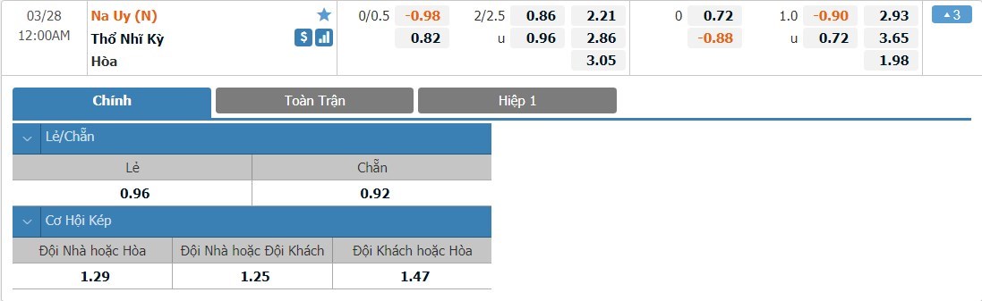 Na Uy được đánh giá cao hơn đôi chút so với Thổ Nhĩ Kỳ ở trận này với tỷ lệ cược 1 ăn 2.21. Thổ Nhĩ Kỳ có tỷ lệ cược là 1 ăn 2.86 trong khi đó tỷ số hòa có tỷ lệ cược là 1 ăn 3.05. Thổ Nhĩ Kỳ đang có phong độ cao. Xét về thực lực, Thổ Nhĩ Kỳ đang hoàn toàn không thua kém Na Uy và mạo hiểm với cửa dưới Thổ Nhĩ Kỳ sẽ là lựa chọn không quá tệ ở kèo đấu này.