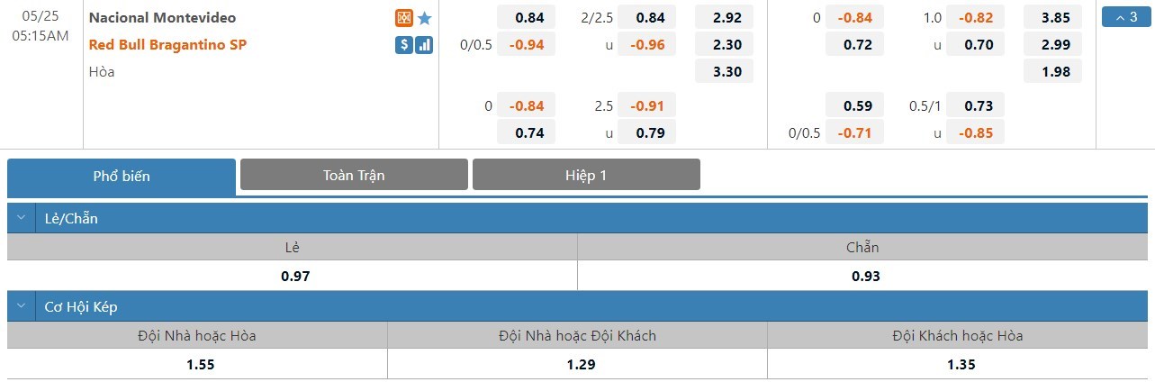 Soi kèo châu Á Nacional Montevideo vs RB Bragantino