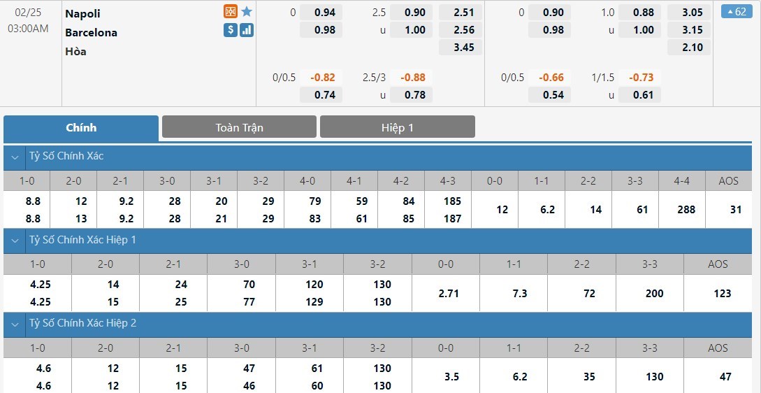 Soi kèo tài xỉu, kèo tỷ số Napoli vs Barcelona