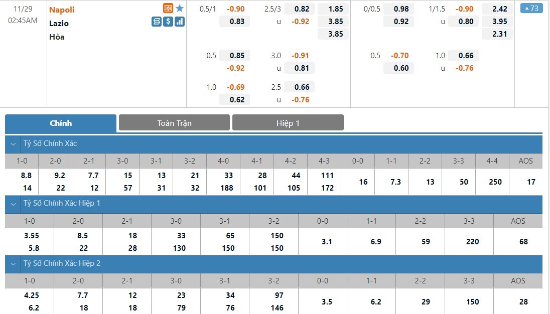 Dự đoán kèo tỷ số hiệp 1: Napoli 1-1 Lazio