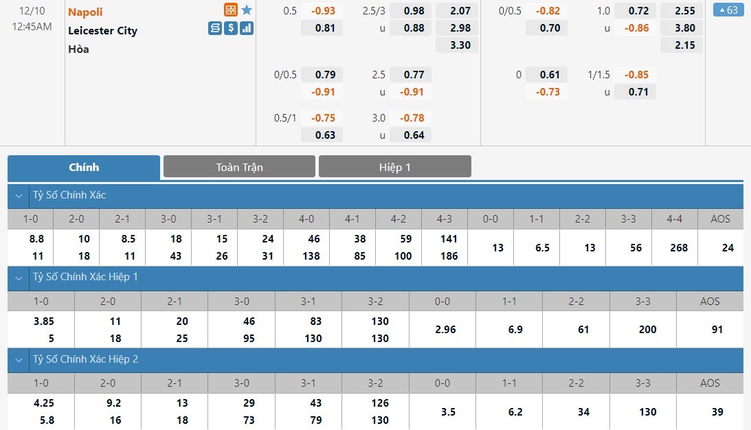 Dự đoán kèo tỷ số hiệp 1: Napoli 1-1 Leicester City