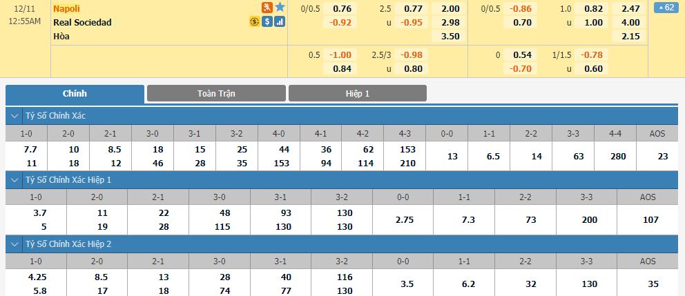 Dự đoán kèo tỷ số hiệp 1: Napoli 1-1 Real Sociedad