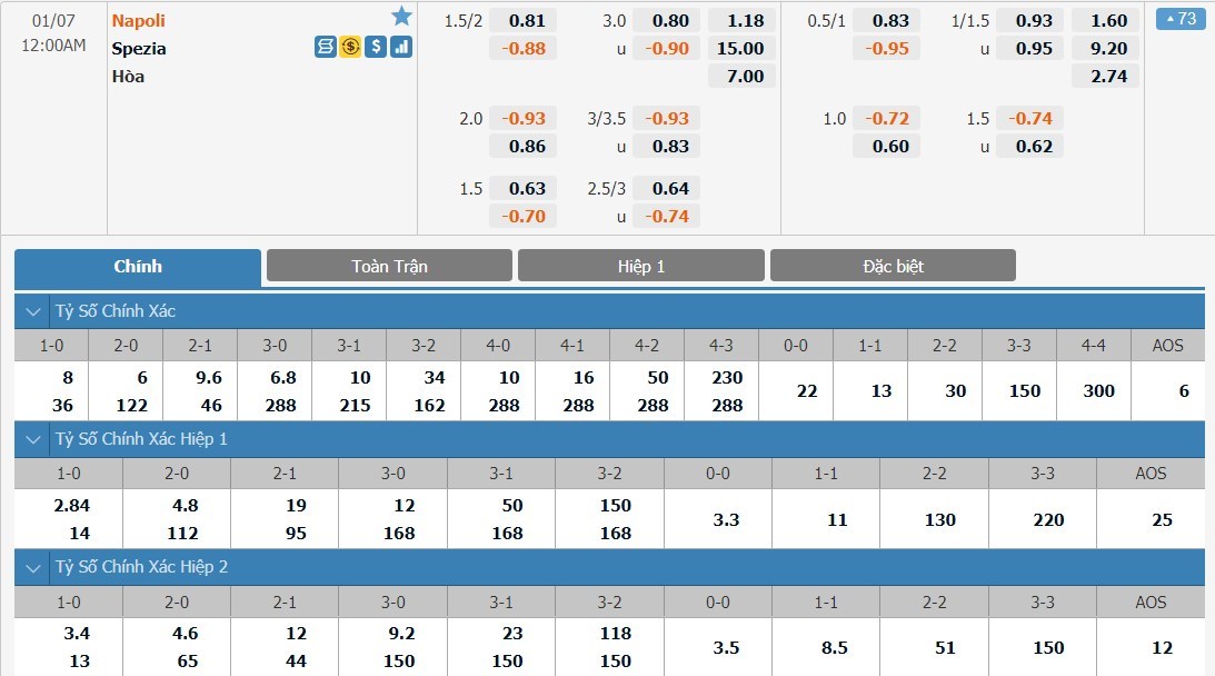 Napoli được đánh giá cao hơn Spezia rất nhiều ở kèo đấu này. Đội chủ nhà có tỷ lệ cược chỉ là 1 ăn 1.18 trong khi đội khách có tỷ lệ cược lên tới 1 ăn 15.00. Tỷ số hòa có tỷ lệ cược là 1 ăn 7.00. So với Napoli, Spezia vẫn đang tỏ ra thua kém quá nhiều. Phong độ của Spezia cũng đang là không tốt và họ sẽ khó tránh được một trận thua ở trận này.