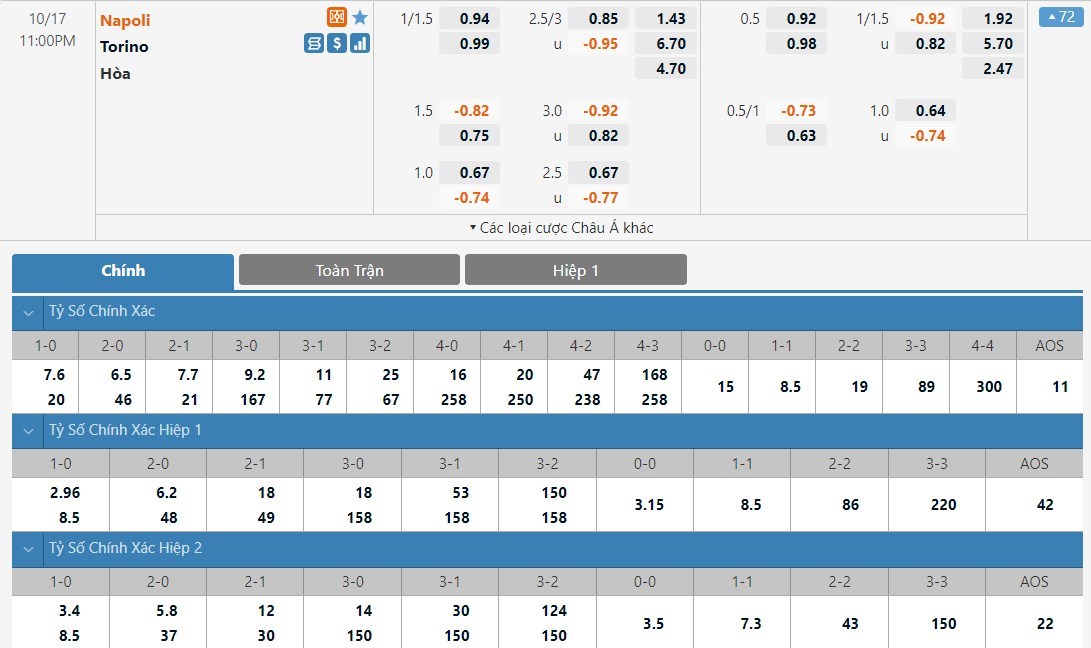 Napoli sẽ được đánh giá cao hơn Torino khá nhiều ở kèo đấu này. Đội chủ nhà chỉ có tỷ lệ cược là 1 ăn 1.43 trong khi đó đội khách có tỷ lệ cược lên tới 1 ăn 6.70. Tỷ số hòa có tỷ lệ cược là 1 ăn 4.70. Napoli đang được đánh giá rất cao với phong độ ấn tượng. Trong khi đó Torino vẫn đang thi đấu không quá nổi bật và Napoli sẽ đủ khả năng giành 1 chiến thắng ở trận này.