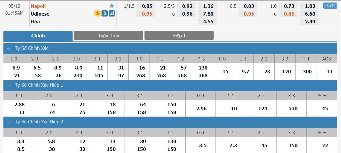 Soi kèo tài xỉu, kèo tỷ số Napoli vs Udinese