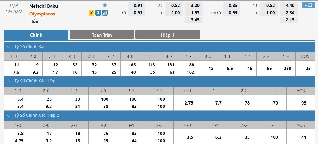 Dự đoán kèo tỷ số hiệp 1: Neftchi Baku 0-0 Olympiacos