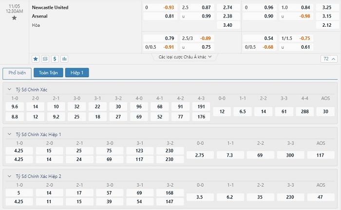 Soi kèo châu Á Newcastle United vs Arsenal