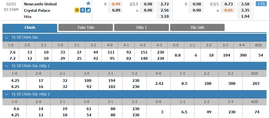 Trong 8 lần gần nhất Newcastle gặp Crystal Palace, không lần nào trận đấu có thể kết thúc với nhiều hơn 2 bàn thắng được ghi. Cả Newcastle và Crystal Palace đều là những đội sở hữu lối chơi thiếu đột biến và những trận đấu của họ cũng thường diễn ra kém hấp dẫn với rất ít bàn thắng xuất hiện. Với tỷ lệ tài xỉu ở mức 2 1/4 trái, ô cược xỉu sẽ là lựa chọn cho kèo đấu này.