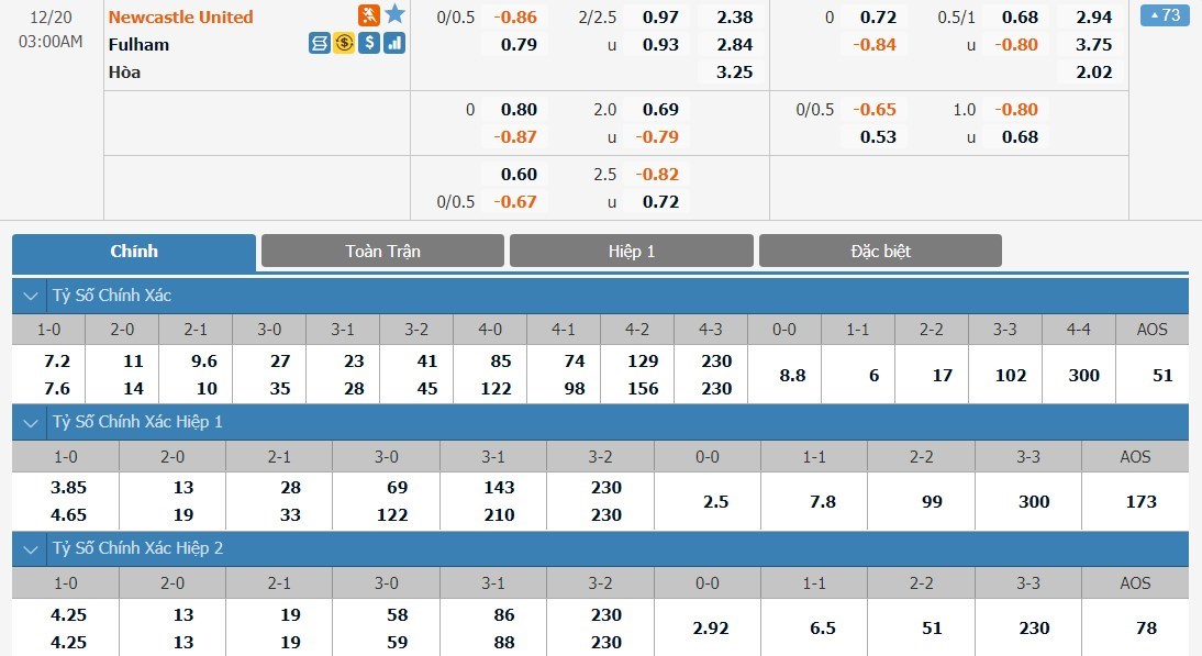 Tỷ lệ cược của 2 đội bóng ở kèo đấu này sẽ không có sự chênh lệch quá lớn. Với lợi thế sân nhà, Newcastle sẽ được đánh giá cao hơn đôi chút so với Fulham. Tuy nhiên đây là lúc mà Newcastle đang gặp khó khăn khi mà một loạt trụ cột của họ dính chấn thương. Phong độ của Fulham ở những trận vừa qua cũng có dấu hiệu khởi sắc hơn và họ nhiều khả năng sẽ kiếm được 1 kết quả hòa ở trận này.
