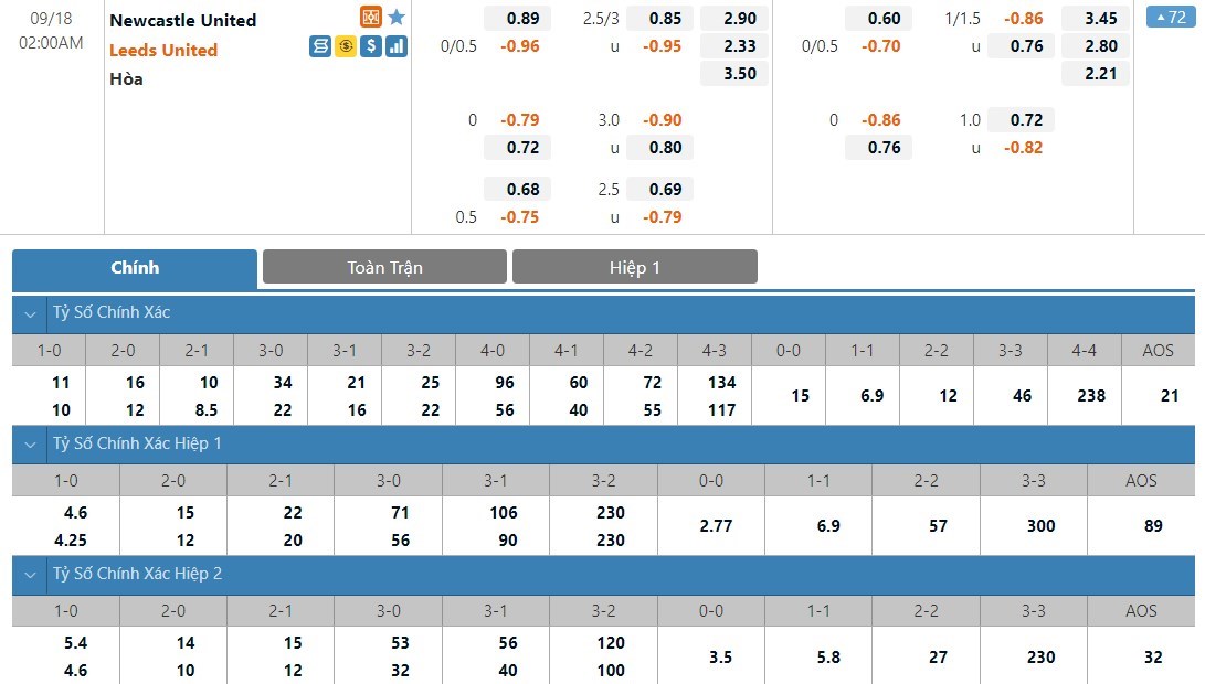 Leeds vẫn được đánh giá cao hơn đôi chút so với Newcastle ở trận này dù họ là đội làm khách. Tỷ lệ cược của Leeds là 1 ăn 2.33 trong khi đó Newcastle có tỷ lệ cược là 1 ăn 2.90. Tỷ số hòa có tỷ lệ cược là 1 ăn 3.50. Newcastle có thể nói là một đối thủ khá ưa thích của Leeds. Trước một đối thủ khá vừa sức, Leeds có thể sẽ có chiến thắng ở trận này.