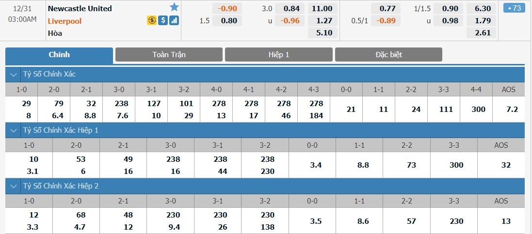 Không bất ngờ khi mà Liverpool vẫn được đánh giá cao hơn Newcastle rất nhiều ở trận này. Đội khách chỉ có tỷ lệ cược là 1 ăn 1.27 trong khi đội chủ nhà có tỷ lệ cược lên tới 1 ăn 11.00. Tỷ số hòa có tỷ lệ cược là 1 ăn 5.10. Newcastle đang thi đấu không mấy ấn tượng và đây không phải lúc mà họ có thể tạo ra được bất ngờ trước Liverpool. Với sức mạnh vượt trội, Liverpool vẫn sẽ có 3 điểm ở trận này.