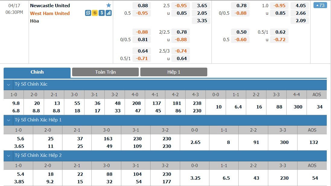 West Ham được đánh giá cao hơn Newcastle khá nhiều lúc này. Đội khách chỉ có tỷ lệ cược là 1 ăn 2.05 trong khi đó đội chủ nhà có tỷ lệ cược lên tới 1 ăn 3.65. Tỷ số hòa có tỷ lệ cược là 1 ăn 3.35. West Ham vẫn đang cho thấy một lối chơi rất hiệu quả. Chỉ phải làm khách trước một đối thủ dễ chịu, West Ham sẽ không bỏ qua cơ hội giành thêm 1 chiến thắng để tiếp tục đua top 4.