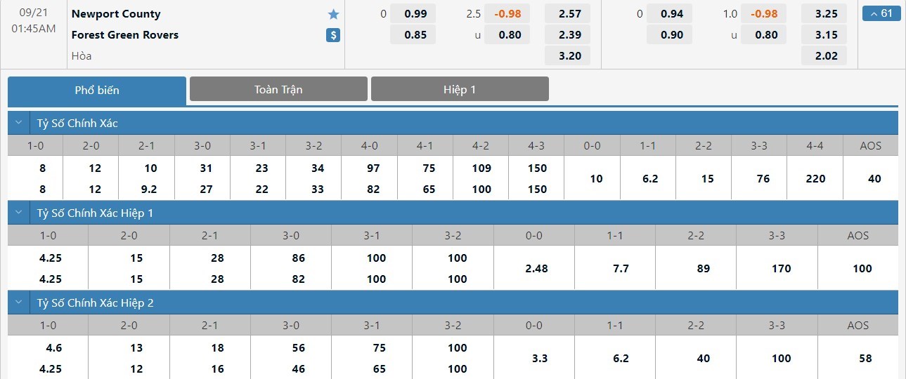 Dự đoán kèo tỷ số hiệp 1: Newport County 0-2 Forest Green Rovers
