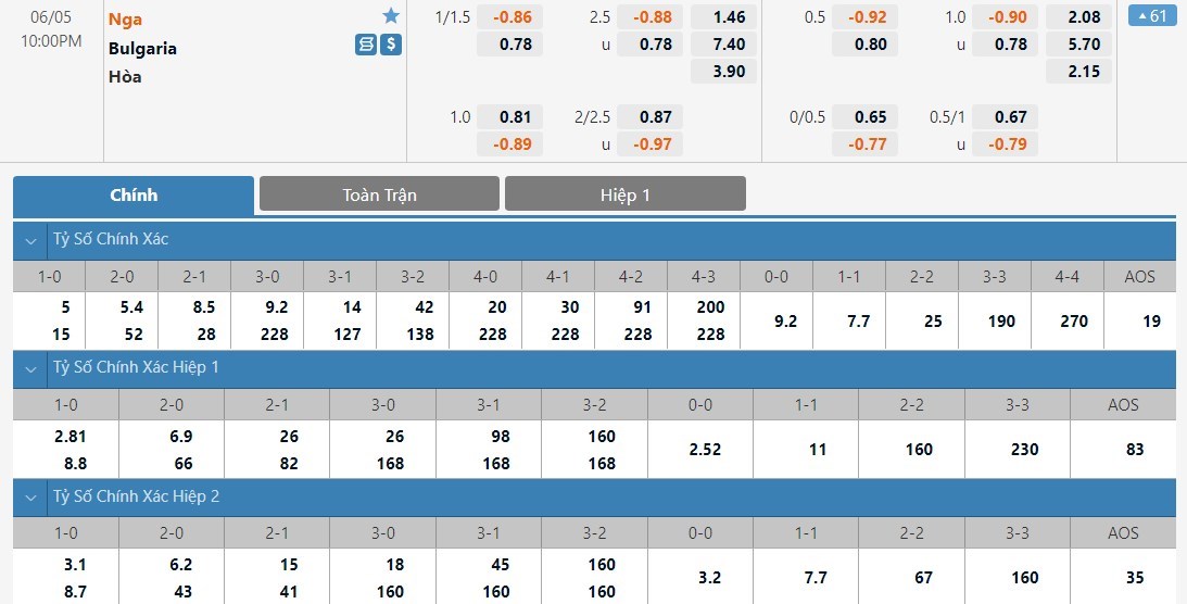 Soi kèo tài xỉu, kèo tỷ số Nga vs Bulgaria