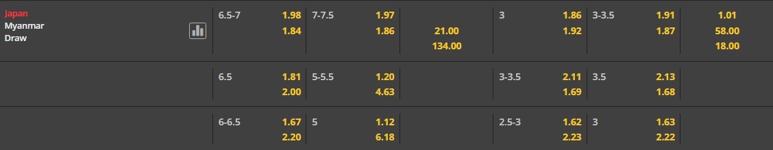 Tỷ lệ cược của Nhật Bản và Myanmar ở trận này vẫn sẽ có sự chênh lệch rất lớn. Myanmar đang tỏ ra khá cố gắng tuy nhiên xét về trình độ, họ vẫn đang thua kém Nhật Bản quá nhiều. Phải làm khách trước một đối thủ quá mạnh, Myanmar gần như không có cơ hội thắng và cửa trên Nhật Bản vẫn sẽ là lựa chọn cho kèo đấu này.
