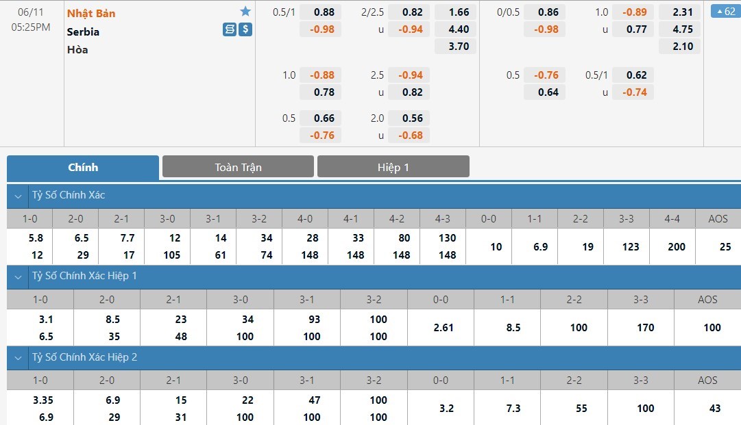 Dự đoán kèo tỷ số hiệp 1: Nhật Bản 2-0 Serbia