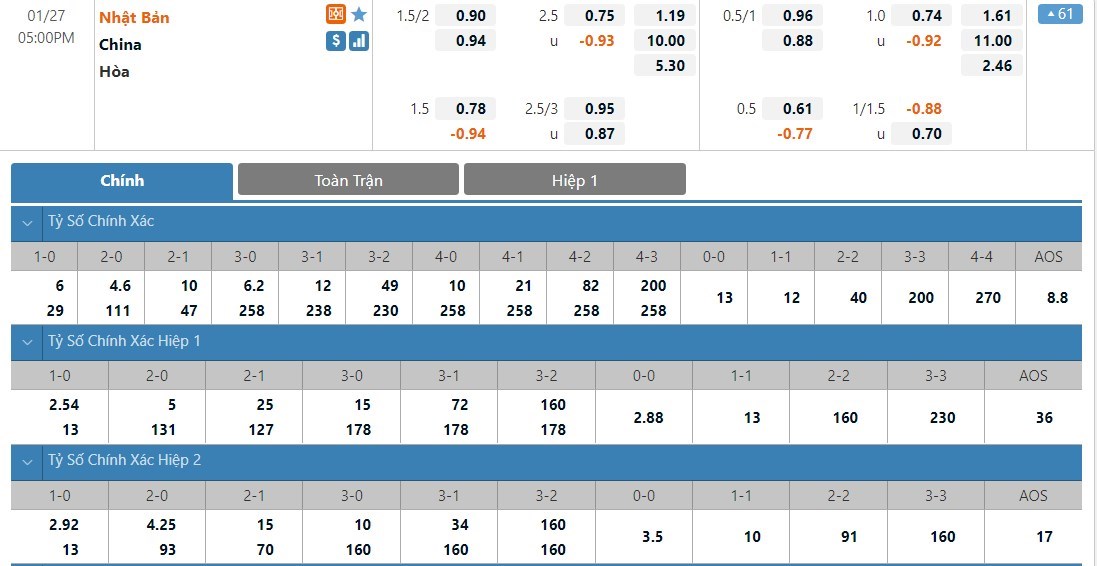 Dự đoán kèo tỷ số hiệp 1: Nhật Bản 0-0 Trung Quốc