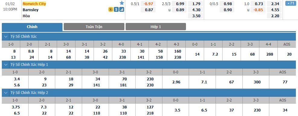 Dự đoán kèo tỷ số hiệp 1: Norwich 1-1 Barnsley