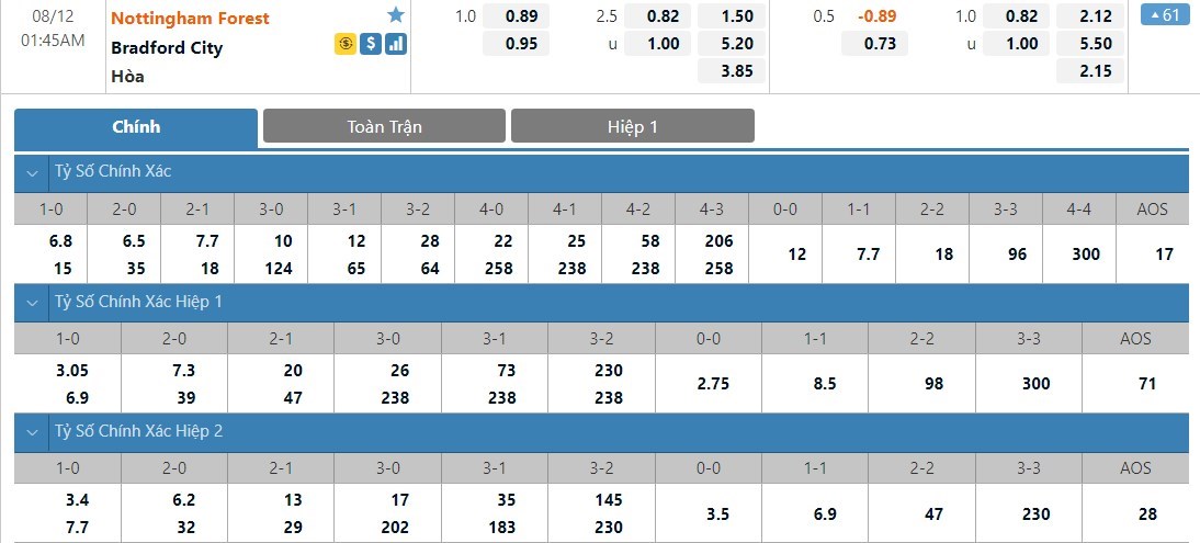 Nottingham Forest sẽ được đánh giá cao hơn Bradford rất nhiều ở kèo đấu này. Tỷ lệ cược của đội chủ nhà chỉ là 1 ăn 1.50 trong khi đó đội khách có tỷ lệ cược lên tới 1 ăn 5.20. Tỷ số hòa có tỷ lệ cược là 1 ăn 3.85. Bradford chỉ là một đội hàng 3 và họ đang bị đánh giá rất thấp. Trước một đối thủ vừa sức, Nottingham Forest vẫn sẽ có chiến thắng ở trận này.