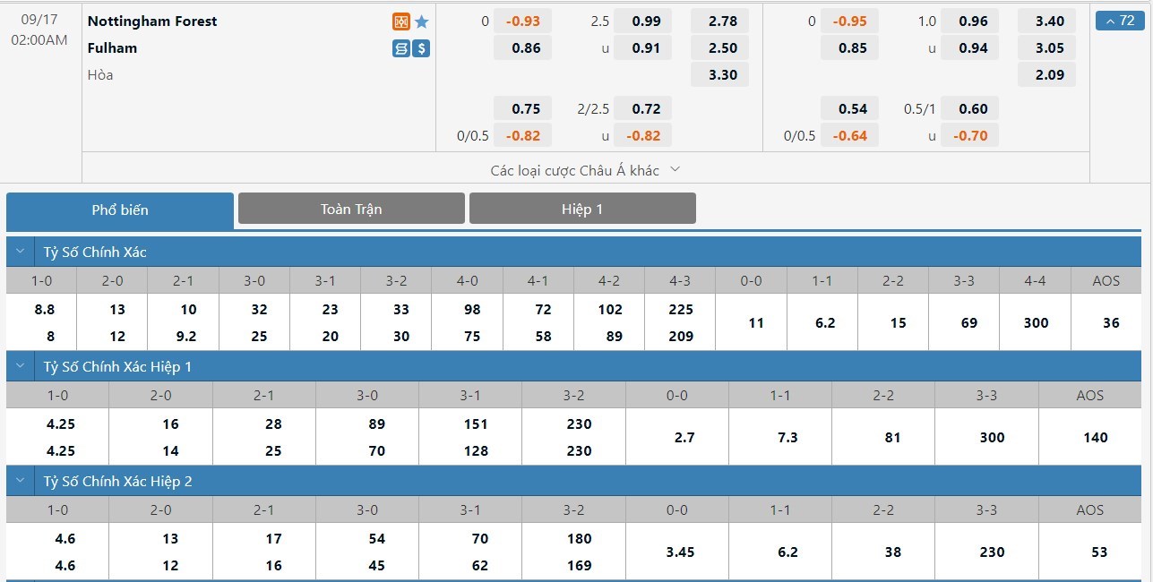 Tỷ lệ cược của Nottingham và Fulham ở kèo đấu này gần như cân bằng. Kết quả Nottingham thắng trận có tỷ lệ cược là 1 ăn 2.78 trong khi đó kết quả Fulham thắng trận có tỷ lệ cược là 1 ăn 2.50. Tỷ số hòa có tỷ lệ cược là 1 ăn 3.30. Đây là 2 đội bóng được đánh giá có trình độ rất ngang ngửa. Nhiều khả năng họ sẽ tạo ra một thế trận cân bằng và hai đội sẽ cầm chân nhau ở trận này. Ô cược hòa sẽ là lựa chọn được đánh giá cao.
