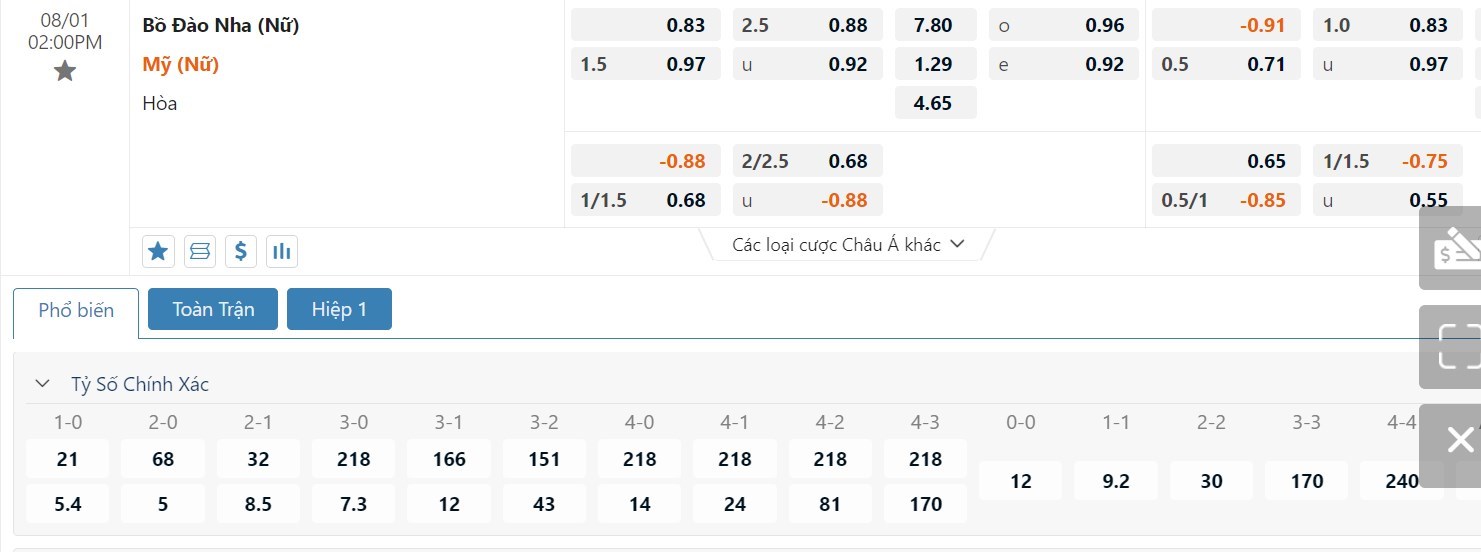 Dự đoán kèo tỷ số hiệp 1: Nữ Bồ Đào Nha 0-1 Nữ Mỹ