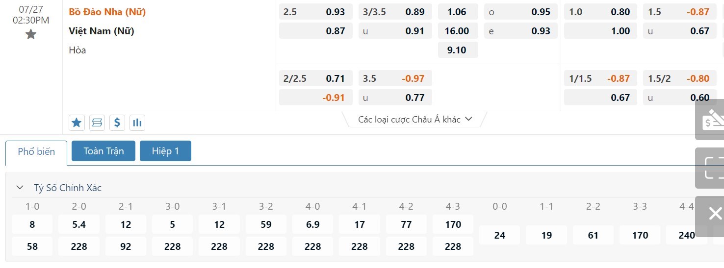 Dự đoán kèo tỷ số hiệp 1: Nữ Bồ Đào Nha 2-0 Nữ Việt Nam
