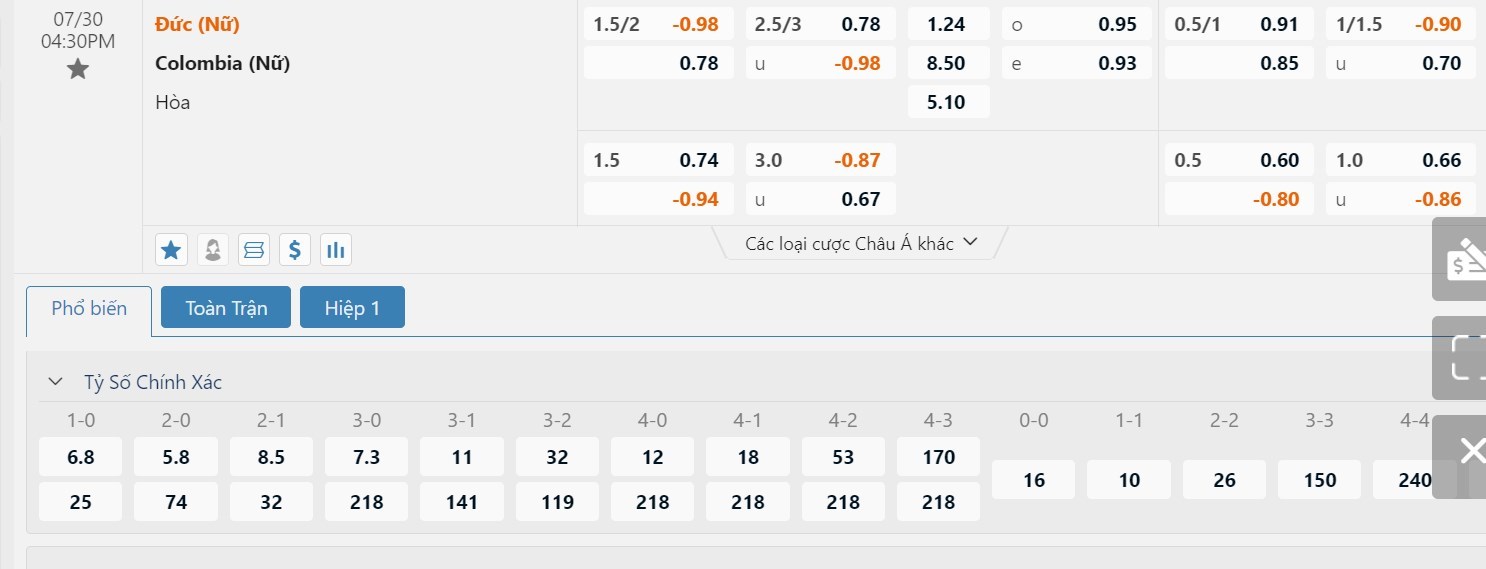 Dự đoán kèo tỷ số hiệp 1: Nữ Đức 1-0 Nữ Colombia
