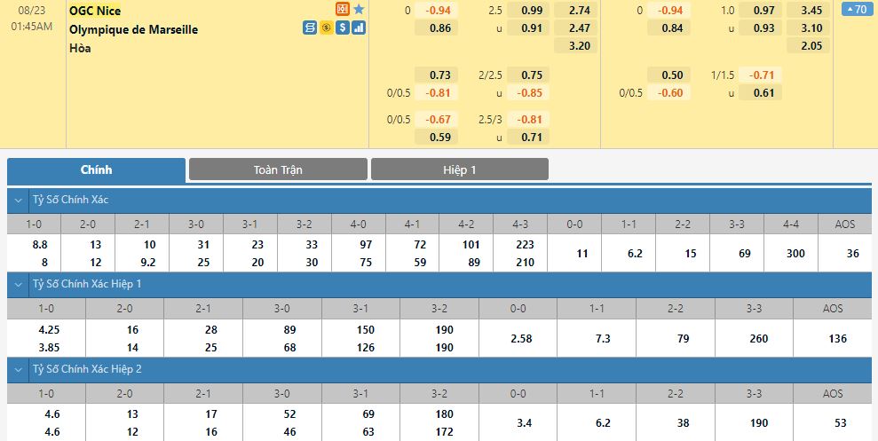 Soi kèo tài xỉu, kèo tỷ số OGC Nice vs Olympique Marseille