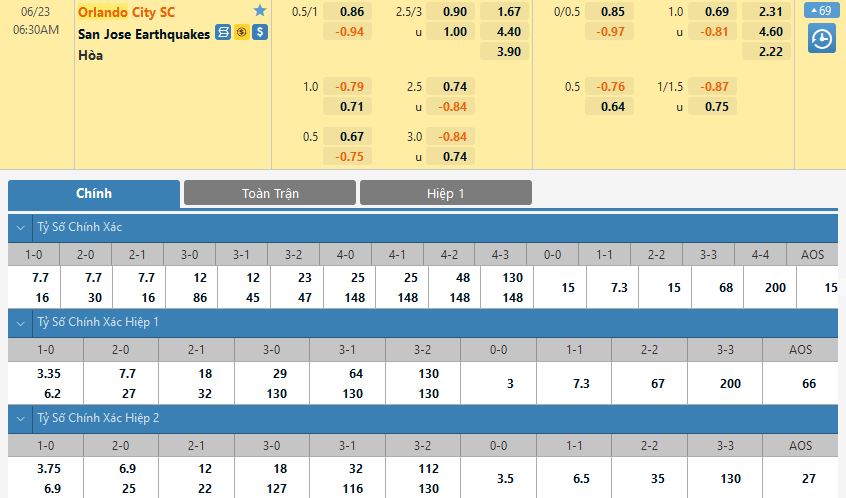 Dự đoán kèo tỷ số hiệp 1: Orlando City 2-0 San Jose Earthquakes
