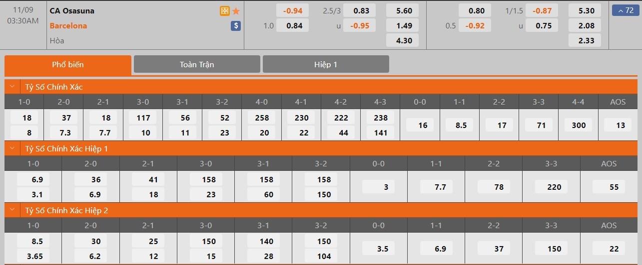 Dự đoán kèo tỷ số hiệp 1: Osasuna 0-2 Barcelona