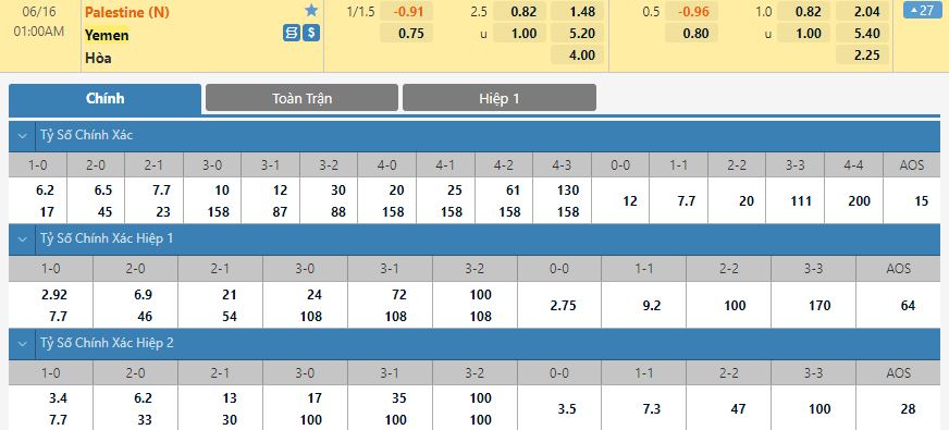 Dự đoán kèo tỷ số hiệp 1: Palestine 2-0 Yemen