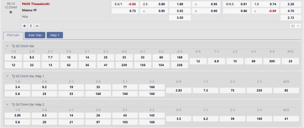 Soi kèo tài xỉu, kèo tỷ số PAOK vs Malmo FF