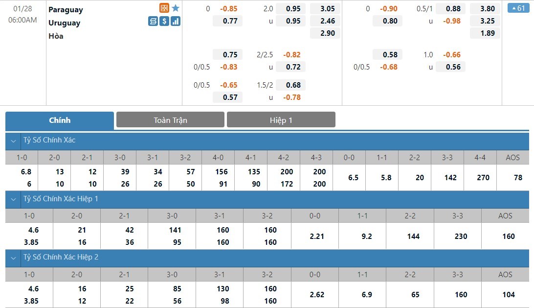Soi kèo tài xỉu, kèo tỷ số Paraguay vs Uruguay