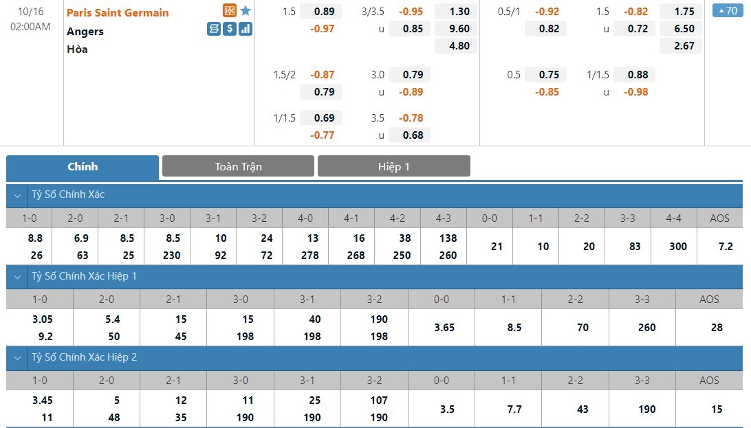 PSG vẫn sẽ được đánh giá cao hơn Angers khá nhiều ở kèo đấu này. Tỷ lệ cược của PSG là 1 ăn 1.30 trong khi đó Angers có tỷ lệ cược lên tới 1 ăn 9.60. Tỷ số hòa có tỷ lệ cược là 1 ăn 4.80. Xét về thực lực 2 đội, PSG vẫn đang nhỉnh hơn Angers không ít. Đây là lúc mà PSG cũng đang rất khao khát chiến thắng và được chơi trên sân nhà họ sẽ không bỏ qua cơ hội này.