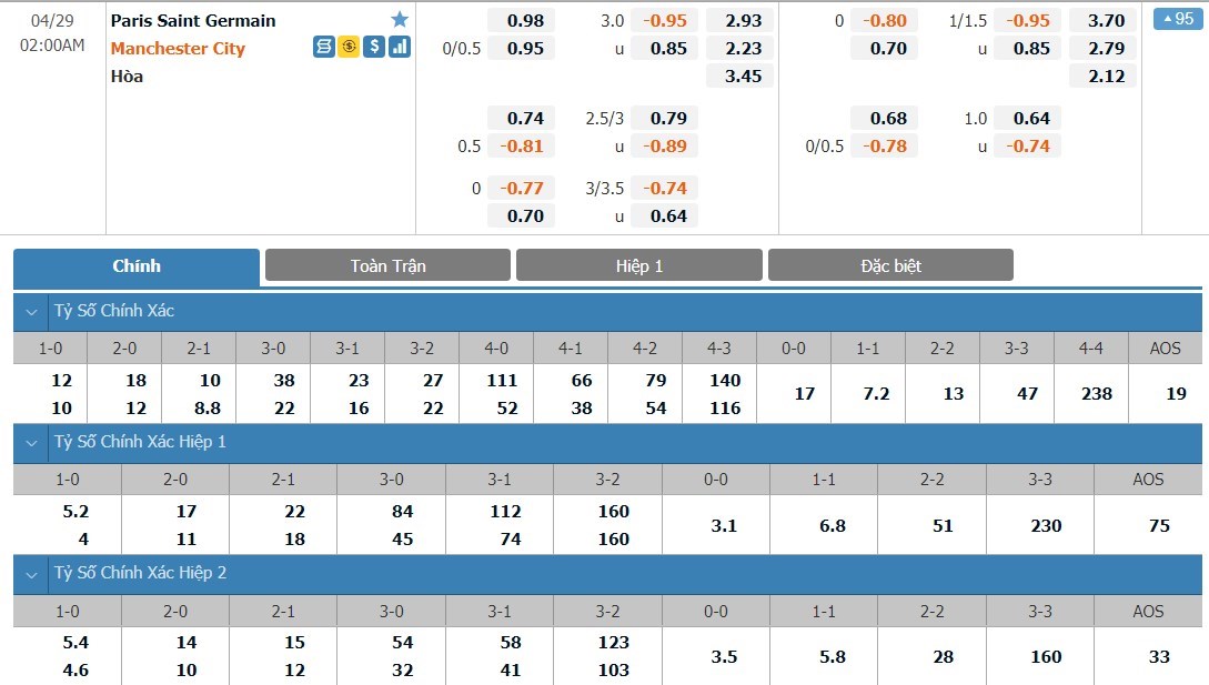 Soi kèo tài xỉu, kèo tỷ số Paris Saint Germain vs Manchester City