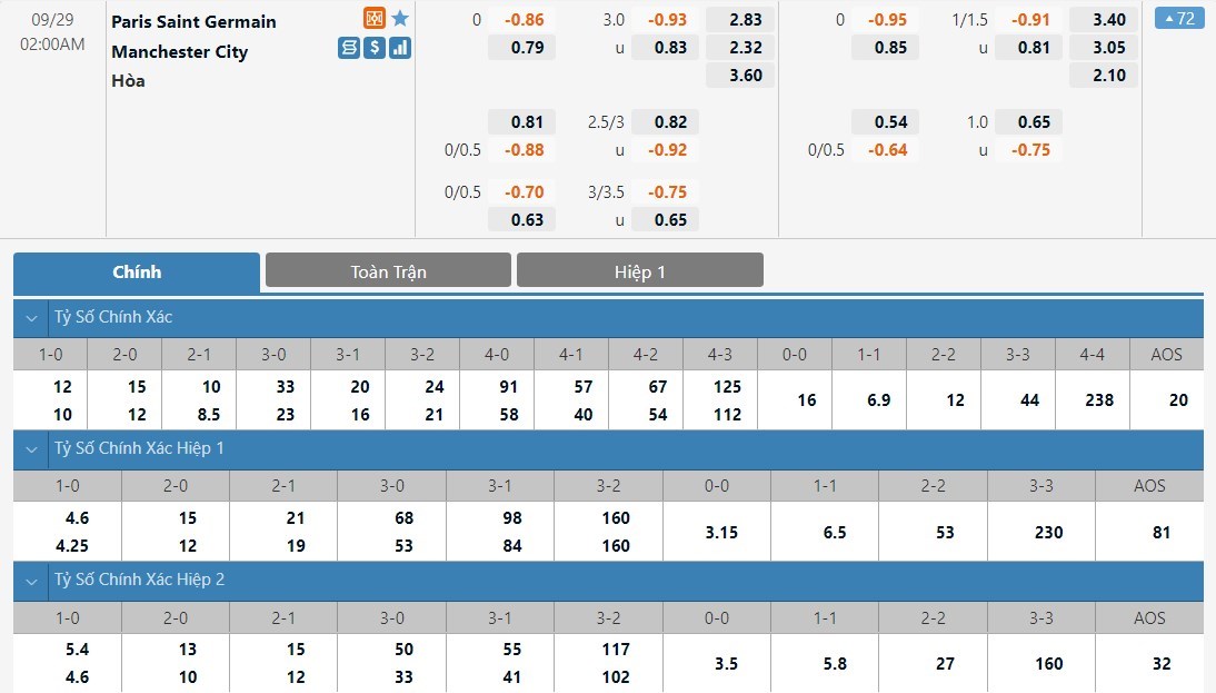Soi kèo tài xỉu, kèo tỷ số Paris Saint Germain vs Manchester City