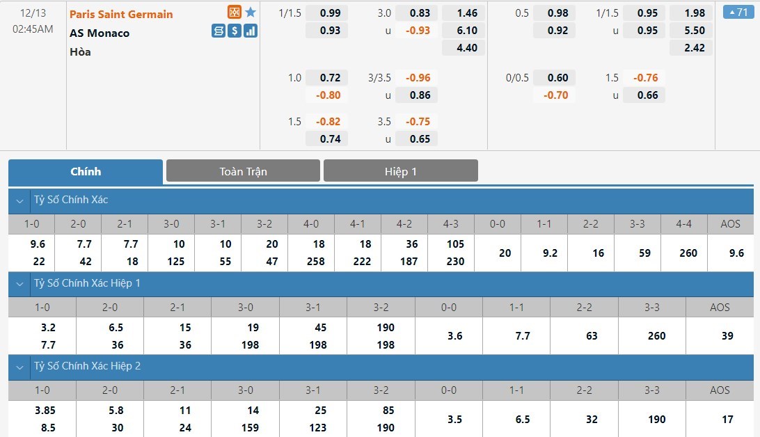 Soi kèo châu Á Paris Saint Germain vs Monaco