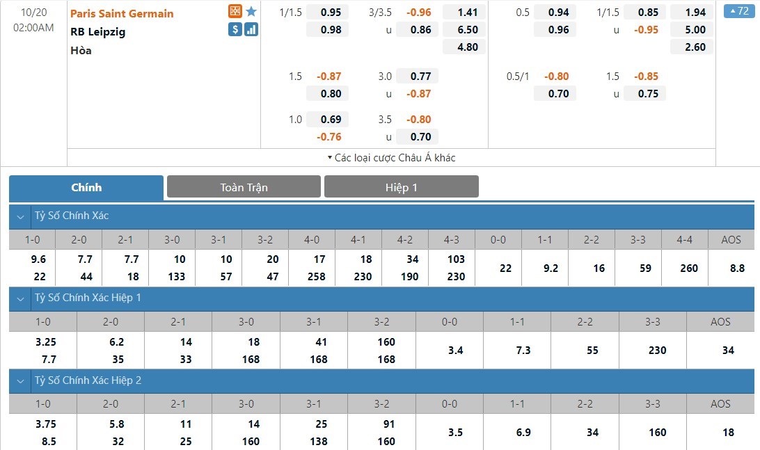 Soi kèo tài xỉu, kèo tỷ số Paris Saint Germain vs RB Leipzig