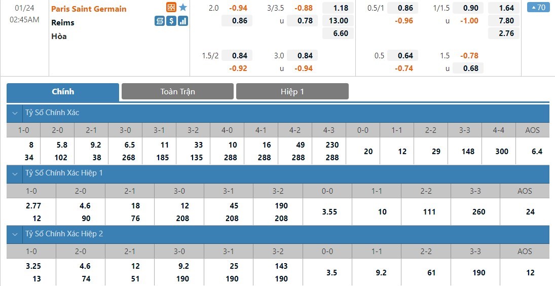 PSG vẫn sẽ được đánh giá cao hơn Reims rất nhiều ở kèo đấu này. Tỷ lệ cược của PSG chỉ là 1 ăn 1.18 trong khi đó Reims có tỷ lệ cược lên tới 1 ăn 13.00. Tỷ số hòa có tỷ lệ cược là 1 ăn 6.60. Reims lúc này không phải đối thủ xứng tầm với PSG và đội chủ nhà vẫn sẽ có một chiến thắng khi mà họ còn được chơi trên sân nhà.